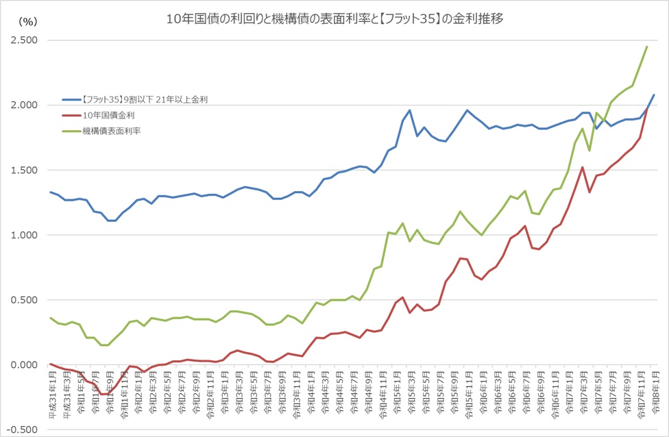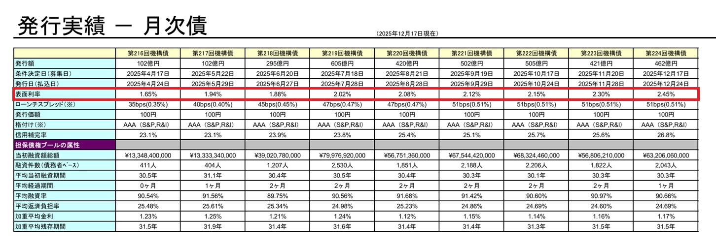 住宅金融支援機構の既発債情報で機構債の表面利率を確認し、【フラット35】の金利推移と並べて見ると、2025年5月から