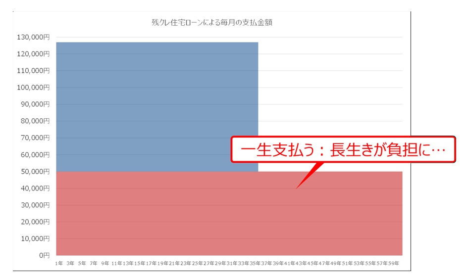 住宅ローン部分は返済が進むにつれて元金が減るため利息の支払いも減りますが、残価部分は元金が1円も減らないため、残クレ住宅ローンとは「住宅ローン返済をしながら、元金が減らない借入を同時に抱える構造」であり、住宅ローン部分の返済が終わっても残価の元金(つまり利息の支払い)は一生残るのです。
