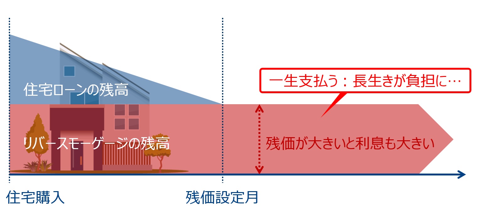 つまり住宅価格は住宅ローン部分+残価部分に分かれ、残価部分はリバースモーゲージの仕組みがそのまま適用されます。